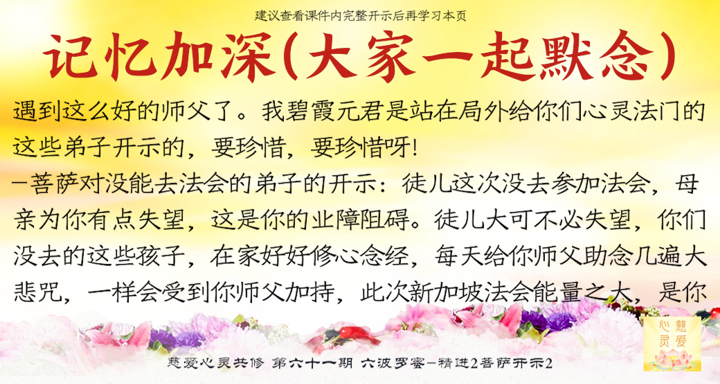 (“心离体相,背尘合觉。大度能度堪为广度,大悲无我方为正觉。即心即佛,舍我其谁。欲成正觉,舍其忘我。我为说法,法身亦同。”)但是师父后来也跟着观世音菩萨弄两句文言文,实际上这几句话就是鼓励大家要精进修行,时不待人啊,时间不等人啊